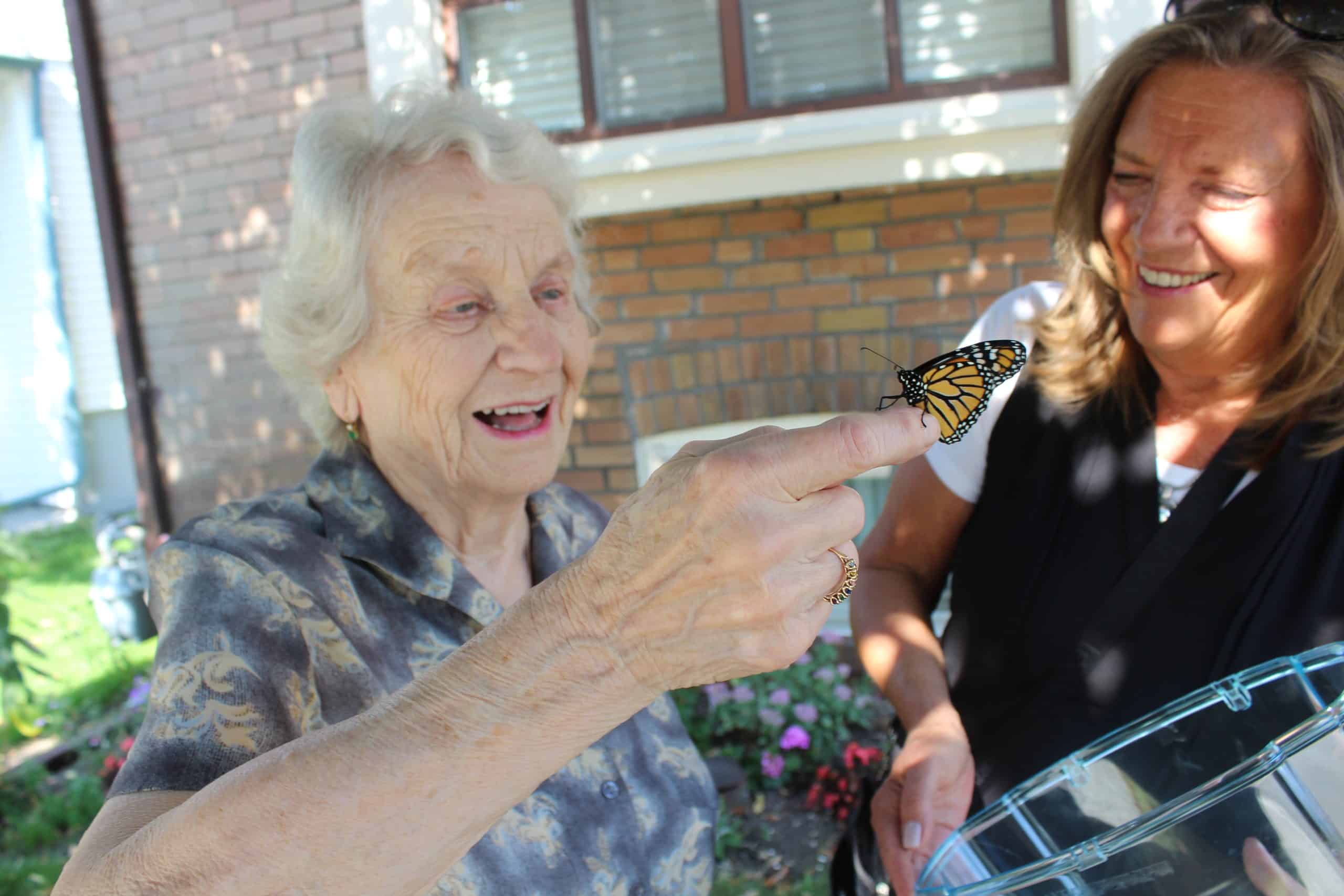 Olga Nazar, 91, checks out the butterfly that grew from the milkweed in her front yard with Felice Strauss, who has raised around 35 monarch butterflies this year.