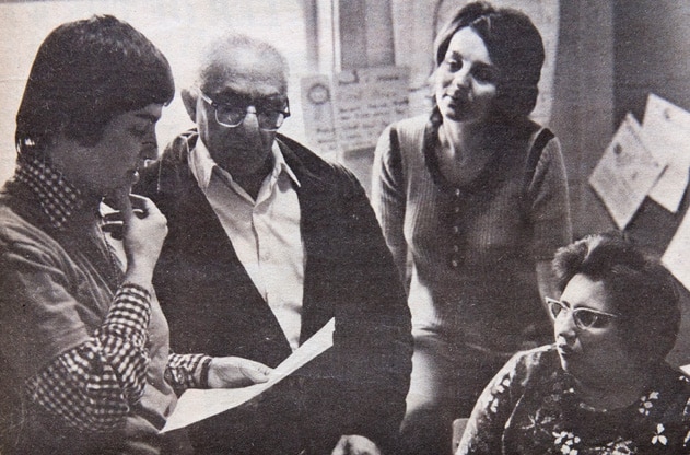 (From Left) Cathie McGhee, Tim Kadry, Sheila Blinoff and Gladys Kadry discuss future of the paper in February, 1973.