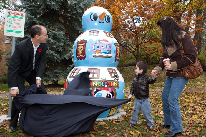Andrew Weir, Vice President, Communications at Toronto Tourism, gets some help from Starlight child Gabriel Cardenas, 3, and his mom Victoria in unveiling one of the 20 seven-foot snowmen that have been placed throughout the city. PHOTO: Phil Lameira / Beach Metro News