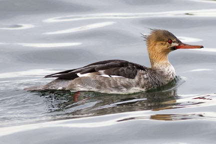They breed as far away as Alaska and across northern Canada and they nest in forested areas along northern rivers and lakes. They lay between 5-11 eggs. The chicks have a dense layer of down, which provides them with excellent insulation by trapping air which makes them buoyant. The merganser can live in both salt water and fresh water. Their plumage is suitable for cold climates. Adult Red-Breasted Mergansers are 51-61cm (16 inches) long with a wingspan of 70-86cm (33 inches). They seldom make calls except during courtship, when the male makes a cat-like “yeow yeow” and the female a harsh “gruk.”
