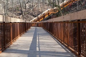 The staircase, bridges, and boardwalk were constructed of hemlock decking and the railings are all brown in hopes of keeping a “wooden feel.”