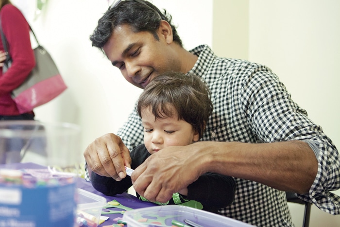 Chris Fernandes and son Henry, 1, work on some colouring at Mrs. Darling’s Imaginarium for Girls and Boys, a pop-up shop that ran in a vacant storefront on Danforth in late October. PHOTO: Phil Lameira / Beach Metro News