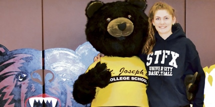 Kim Taylor, a senior at St. Joseph’s College, stands by one of her most ferocious supporters while sporting brand-new colours from St. Francis Xavier, where she was recently signed to play for the St. FX X-Women.