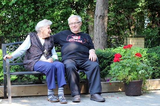 Hazel Ferguson sits with her friend Andy Stratford outside her retirement home on Kingston Road. Since meeting each other at the home, the two have been “joined at the hip,” says Hazel’s daughter Gail.