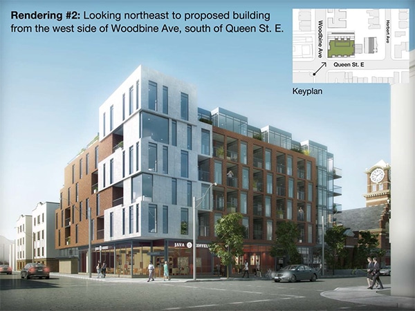 A rendering of the six-storey condo planned for Queen St. East and Woodbine Avenue.