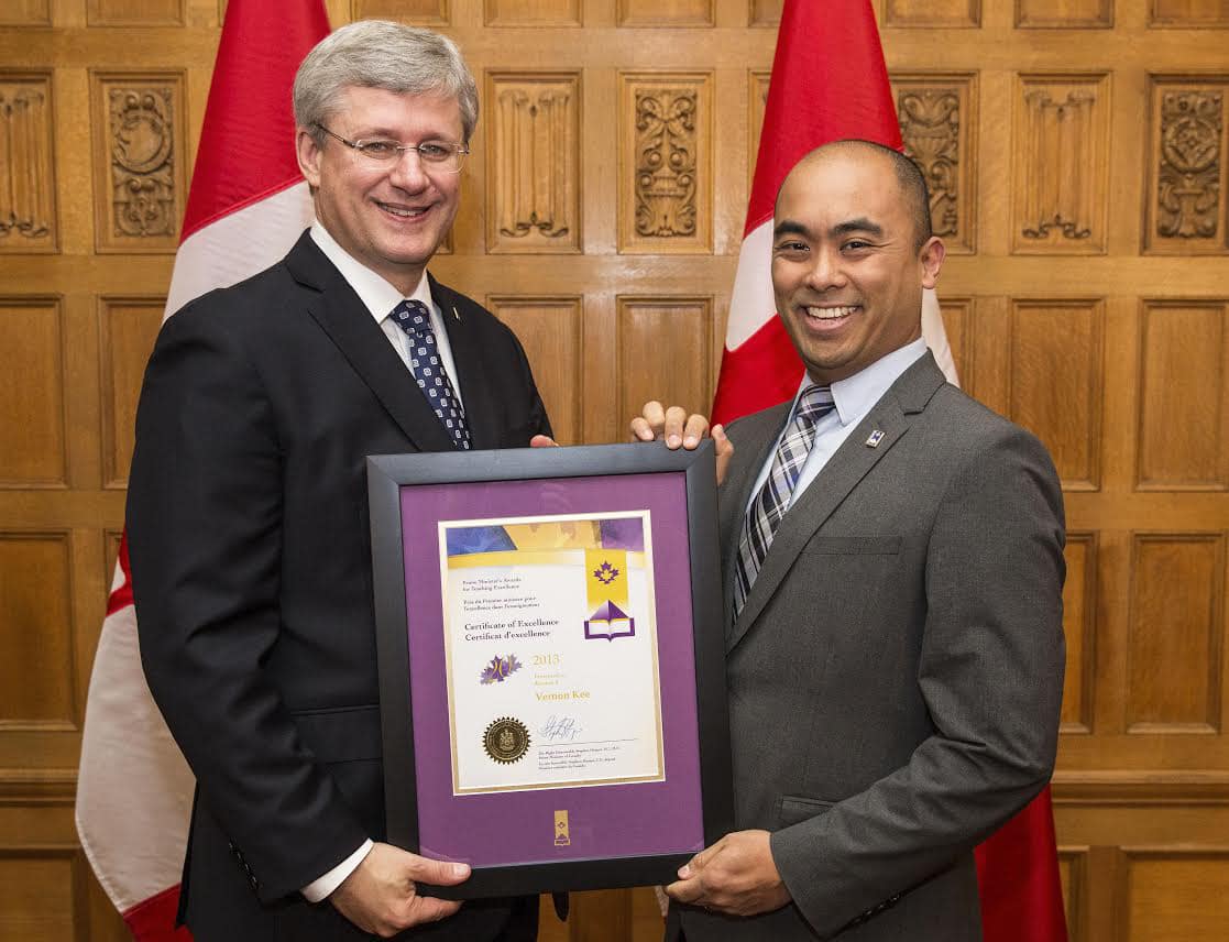 Vernon Kee, right, receives his Excellence in Teaching Award from Prime Minister Stephen Harper.