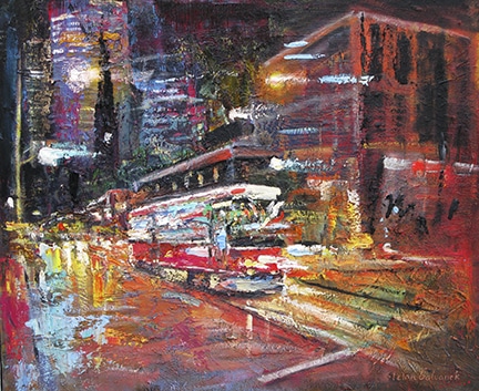 The artist found herself in Nova Scotia exploring small harbours and fishing villages along the coast while her husband, author Ken McGoogan, was teaching writing. She sketched and photographed fishing huts, houses and landscapes, to bring home to her Beach studio for further exploration with acrylic paint.