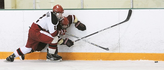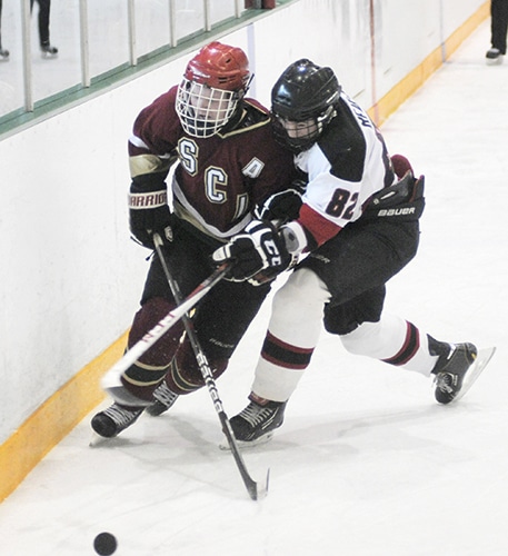 Above, Malvern’s Will McLean works to steal the puck from a Silverthorn CI player. Below, Braden Ream-Neal defends against Silverthorn during the Black Knights’ 4-1 city championship win at North Toronto Arena.