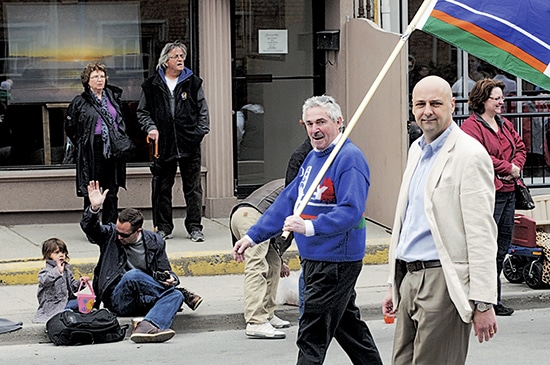 MPP Michael Prue, left, with his Beach flag, and MP Matthew Kellway, right, are seen in the 2012 Beaches Lions Easter Parade. Both have been told elected representatives are not welcome to march in the 2014 parade.
