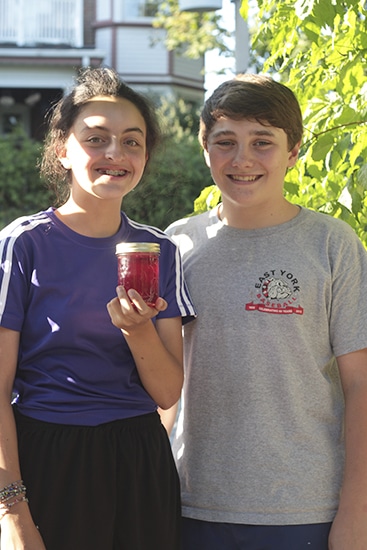 A pair of enterprising 14 year-olds, Anna Khouzam and Nick Gryguc, picked a bumper crop of Concord grapes from the yard at Nick’s grandfather’s house in August — enough for 96 jars of home-made grape jelly that they sold to neighbours for $5 a jar.