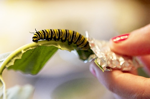 When the eggs hatch, tiny caterpillars emerge. They are kept safe in plastic containers covered with cling wrap and a few air holes. As long as they keep adding milkweed leaves for food, Jennifer says the caterpillars should thrive.