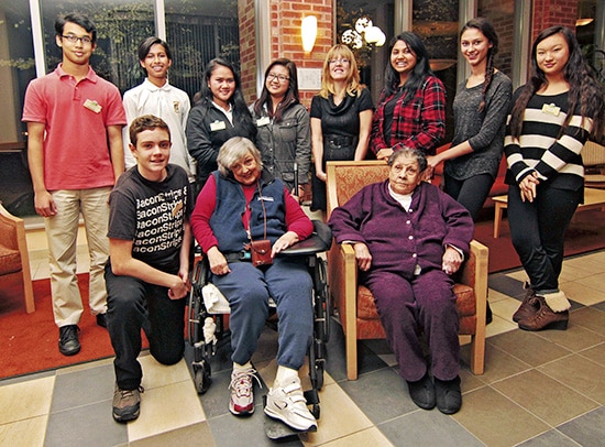 Youth volunteers at the Chester Village long-term care home stop for a photo on Nov. 11 with residents Joan Marshall and Cecilia Howard and volunteer coordinator Andrea Macina.