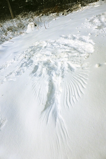 Just a little bit of snow on the ground creates hours of entertainment as I follow fox tracks through the park, swan footprints near the water, and even mink tracks on the ice. One day I was with my friend Chris who was looking down at the snow when she found some unique prints on the ground. There was a large imprint in the snow with a trailing mark behind it. Further along were several other impacts and trails. We never found out for certain what made these odd marks, but a naturalist we contacted suggested it was a big owl or a good sized grouse hopping through the snow. No matter what it was it was an avian snow angel to me.