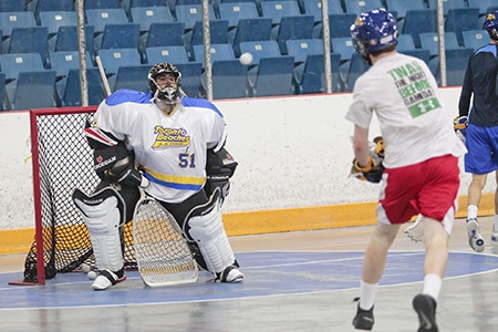 Rookie Jack Kelly takes a shot on veteran Toronto Beaches goaltender Michael Lalani during a May 6 practice in Ted Reeve Arena. The local junior A lacrosse team bested the Mimico Mountainers in their first season game 13-6, and face the Whitby Warriors at their home-opener in Ted Reeve Arena on Friday, May 22, starting at 8 p.m.