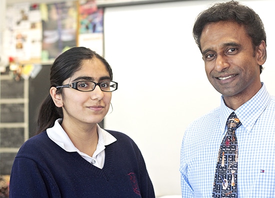 Aisha Parven, a Grade 11 student whose cancer research project won a silver medal at the Canada-Wide Science Fair, stands with her chemistry teacher Dr. Gabriel Ayyavooo at Notre Dame High School on May 20. PHOTO: Andrew Hudson