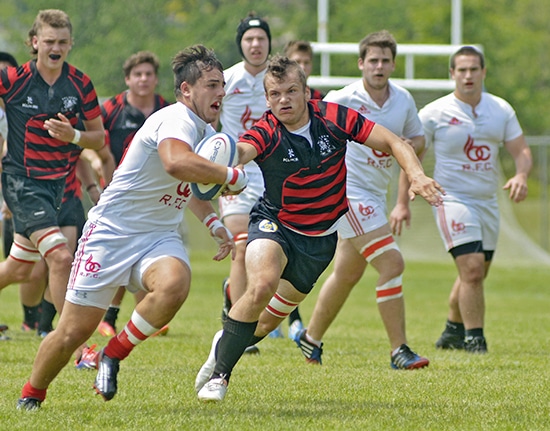 Malvern’s Dylan Silver runs to stop an advance by Unionville’s Bill Crothers Secondary School’s rugby team in OFSAA action in Hamilton on June 5. Malvern won the second-round match 10-6.