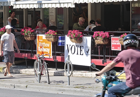Election signs are sprouting up across the country, though some establishments, like the Beacher café, allow space for all candidates, alongside a message encouraging passerby on Queen Street East to take the time to vote in the Oct. 19 federal election.