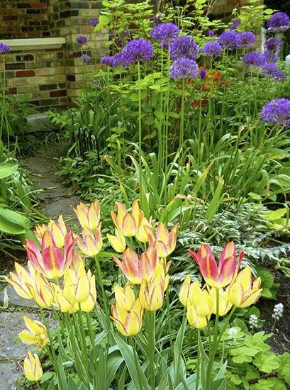 Antoinette tulips and dramatic alliums grow in Beacher Lucille Crighton’s garden.