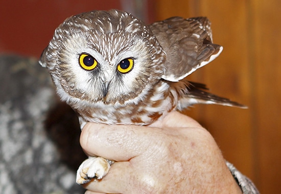 We walked outside, the researcher put the saw-whet owl in my hand, and before I could get a good look at his big yellow eyes he was up and away. By the time we called it quits they had banded another three saw-whets.