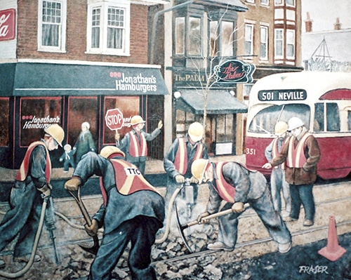 A TTC crew replaces streetcar tracks along Queen Street East in one of Bob Fraser’s many paintings of everyday life in the Beach.
