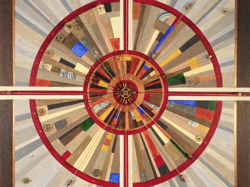 Wong’s mixed media works are abstracted expressions of the city’s straight lines, corners, and asphalt, the intentional opposite of nature landscapes. Her work represents the concrete jungle, using geometric shapes, angular lines, and found objects.