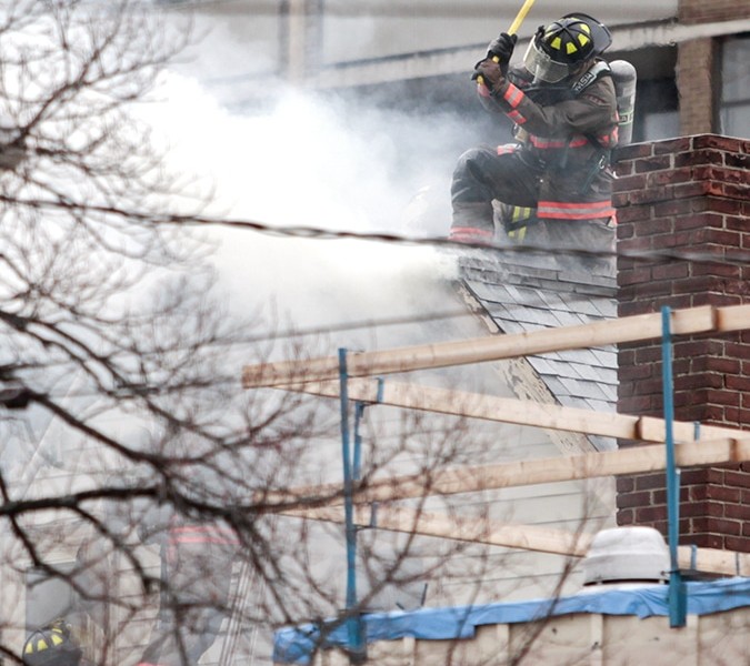 A firefighter chops a hole into the roof of a home that backs on the Giffen-Mack Funeral Home on Danforth Avenue east of Main Street, where a fire broke out after 10 a.m. on Thursday, Nov. 26.