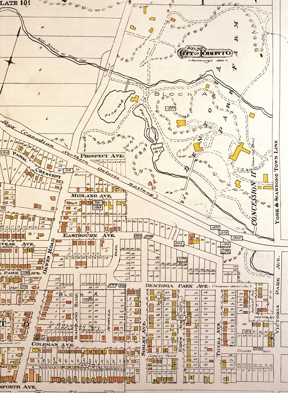 In 1897 Walter Massey created a 100-hectare farm northeast of Toronto’s existing city limits, roughly north of the Danforth between Dawes Road and Pharmacy and including some of the streams and ponds in what is now Taylor Creek Park. He named it Dentonia Park Farm for his wife, Susan Denton Massey.