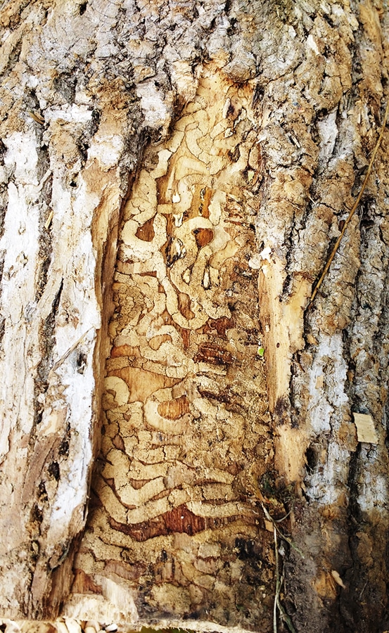 The mature adults are relatively benign and do little harm, other than feeding on upper leaves. The real damage and fatal blow is delivered by their larval offspring, that bore through the cambrium layer just beneath the bark, where they literally strangle and starve the ash to death by destroying the phloem, one of the essential circulatory vessels needed to transport water and nutrients throughout the tree. By the time cracks and fissures appear in the bark and there is a noticeable increase in woodpecker activity hammering away at the trunk looking for a meal, it is too late to be saved. If the victim’s bark is peeled back you will notice complex serpentine patterned galleries where larval feeding has taken place.