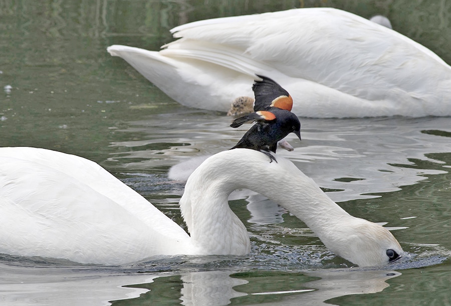 If you’ve ever seen a big bird of prey such as a red-tailed hawk, crow or turkey vulture in the sky being followed and attacked by a small black bird, chances are it is a red-winged blackbird doing the chasing. I’ve even watched a pair of swans come too close to a blackbird’s nest and get hit repeatedly on the head and back. Please watch them and admire their devotion to their chicks, but never antagonize them on purpose. We often forget how stressful our presence must be.