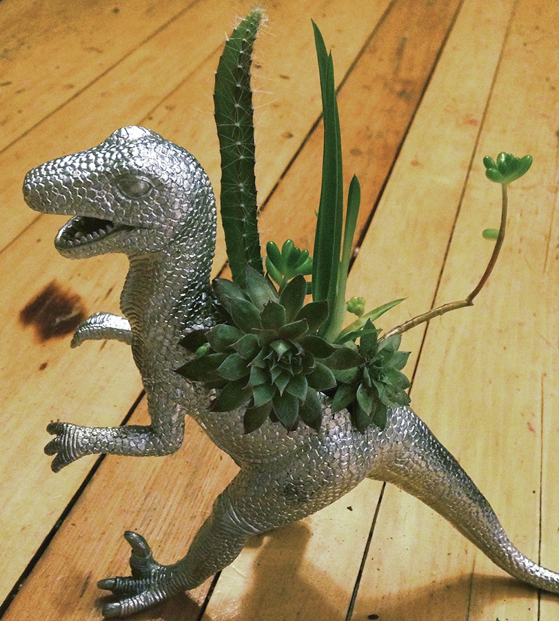 Now a mom herself, Jen has gone beyond using clay pots and terrariums as containers – she plants succulents in toy dinosaurs glitzed up with silver or gold spray paint. “They’re a great thing to do with kids,” she says. “I give them away as birthday presents.”