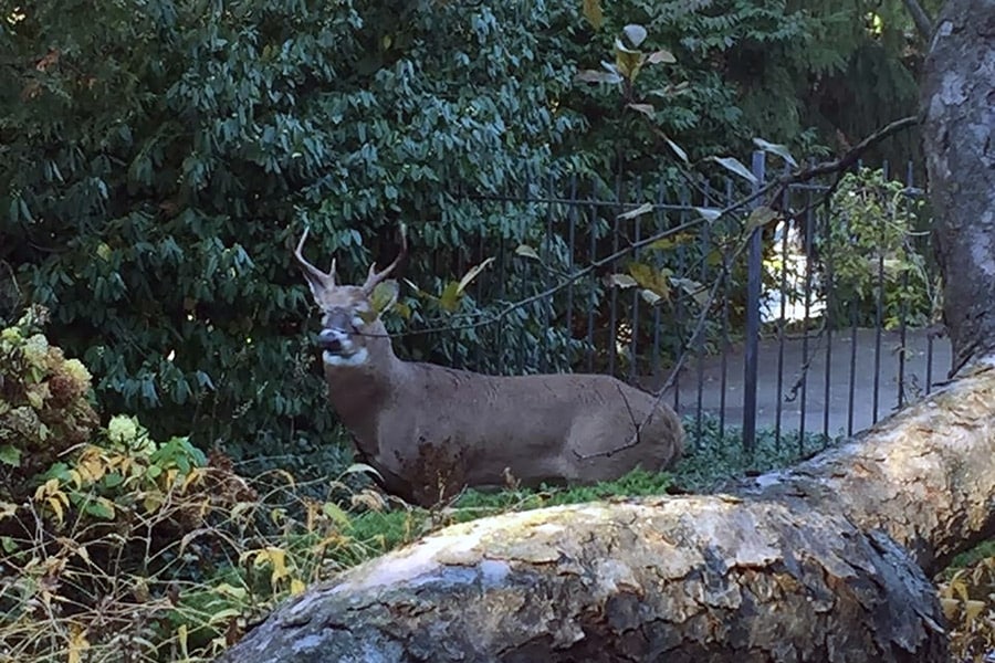 “On November 4 I was dog-sitting for a friend in the Kingston Road and Southwood area when a contractor working on their home came running up to the front door exclaiming there was a deer in the cul-de-sac. I rushed out with my iPhone hoping to catch a glimpse of what I assumed was a doe and/or a fawn. I was astonished to see a majestic buck resting in the neighbour’s backyard. I quickly stopped my rushing – those antlers aren’t just for show after all – and I stood behind a tree to interfere with him as little as possible. Despite my efforts, I swear our eyes met for a few moments before he was heading back into the ravine to continue his urban adventure. Thanks to Taanis Smythe, a neighbour who shared the photo, below.” (Thank you for sharing, Lesley Sheppard.)