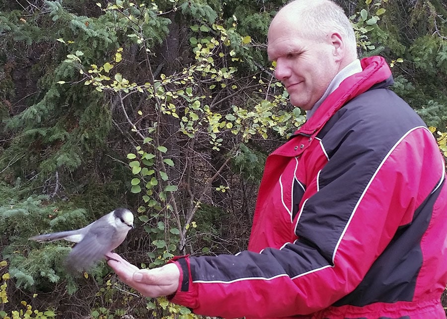 Grey Jays are survivors and have been in Canada for thousands of years. The bird’s name was derived from both the Cree and Algonquin languages: Wìsakedjàk in Algonquin or Wìhsakecàhkw in Cree. They are part of the corvid family (Blue Jays, Crows and Ravens), and they are one of the smartest birds on the planet. One sign of their intelligence is their opportunistically friendly behaviour. For example, if you put food on your hand, especially cranberries, they will come down immediately to take advantage of the situation.