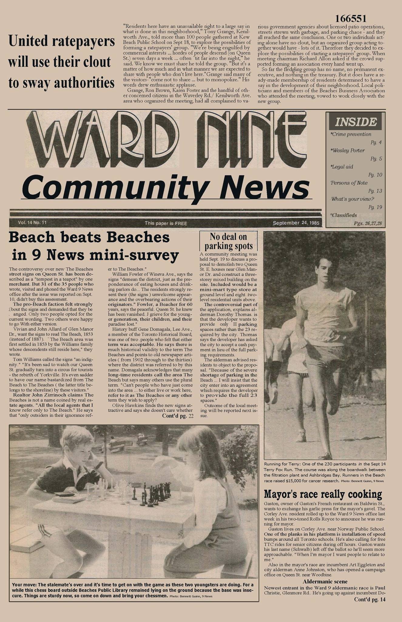There’s been criticism online, but dissent has been tame compared with the near torches-and-pitchforks outrage on Queen Street East – within hours – when signs with the words “The Beaches” appeared between Bellefair and Hammersmith in August 1985. (They were removed soon thereafter.)