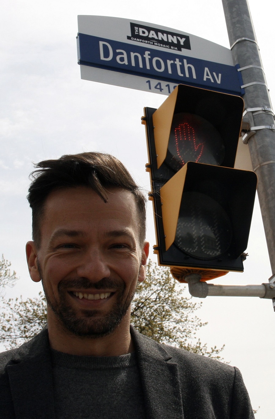 Danforth Mosaic BIA chair Billy Dertilis with one of the neighbourhood’s new “The Danny” signs. PHOTO: Stephen Wickens