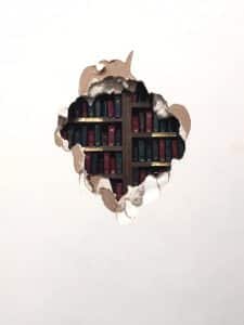 “The Stacks” Christina Kostoff, miniature library sculpture, wall mount 16″x18″, at the Yellow House Gallery & Framing