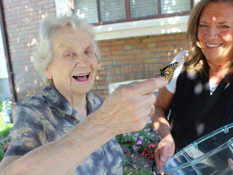 Olga Nazar, 91, checks out the butterfly that grew from the milkweed in her front yard with Felice Strauss, who has raised around 35 monarch butterflies this year.