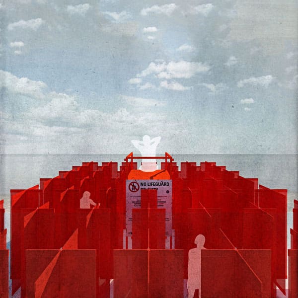 A pop-up obstacle course of sorts, Obstacle features rotating interconnected columns that visitors need to navigate in order to get to the lifeguard stand (and the views it affords) at the core. Teamwork required.