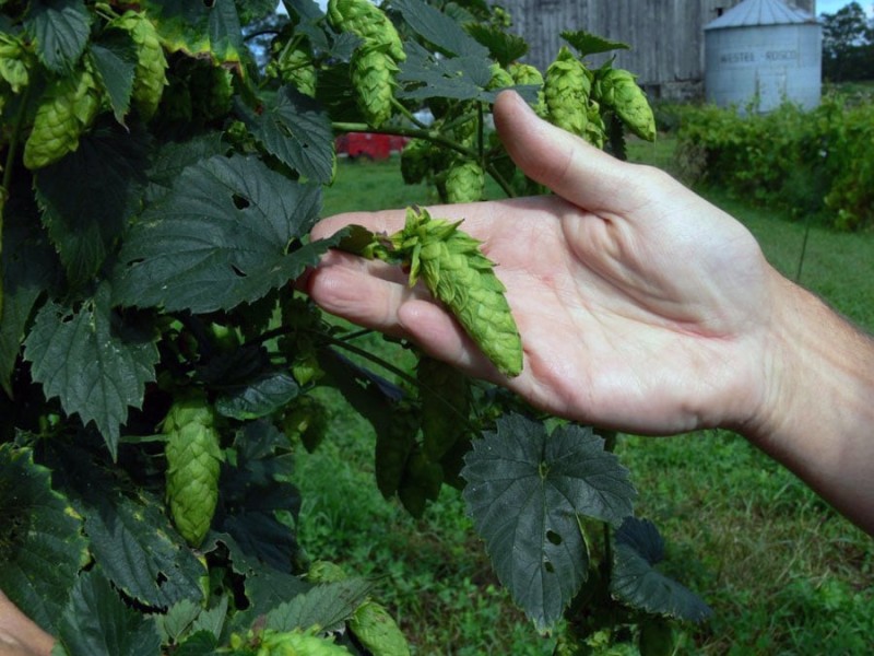 “It’s kind of a neat plant,” Brown says appreciatively. “It’s a beautiful bright green.” At harvest time, the vines are cut off at the root and taken down. Then some growers people hand-pick the cones, and some use machinery. There was one time, Brown tells, that he set the cut plants on his picnic table and picked the cones there.