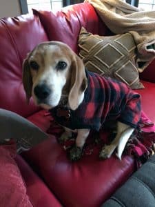 And the foster failure happy hits of 2017 keep on coming! Skipping over July for a moment, I’d like to give a howl-out to my Beagle Bash for Cash promo poster boy from November! Li’l Mac pawed the way for our annual event as yet another example of where the money goes. You may recall he’d been left behind in an empty apartment after his owners moved out. Macaroni has struggled with an auto-immune disorder resulting in loss of fur among other things, but he’s getting better and is now sporting a tail in full bloom! The best thing about his tail these days is how it wags non-stop. He’s got lots to wag about, least of which would be the odd loaf of bread he steals from the kitchen counter. Thing is, he’s pretty good at stealing hearts, too. I think what’s making that tail wag more than anything else is the fact that my rescue partner and her husband recently declared their BIG love for newly nicknamed…Big Mac. Fostering their little bread thief wasn’t cutting it for them anymore. Let’s just say he’s the main breadwinner of the family now.