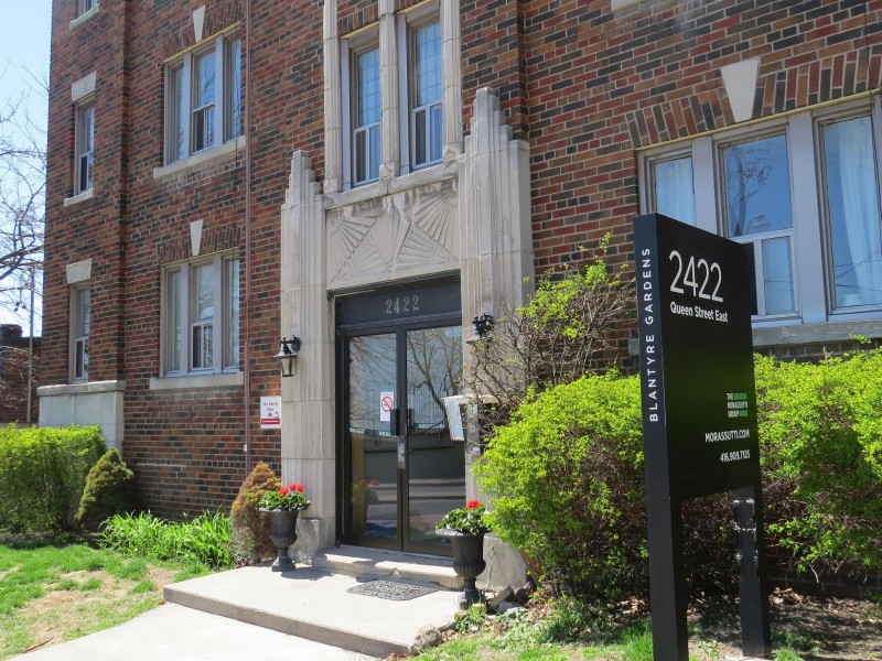 Toronto police say they answered a call about a stabbing at the apartment building at 2422 Queen St. E. just before 3 a.m. on Sunday, May 6.