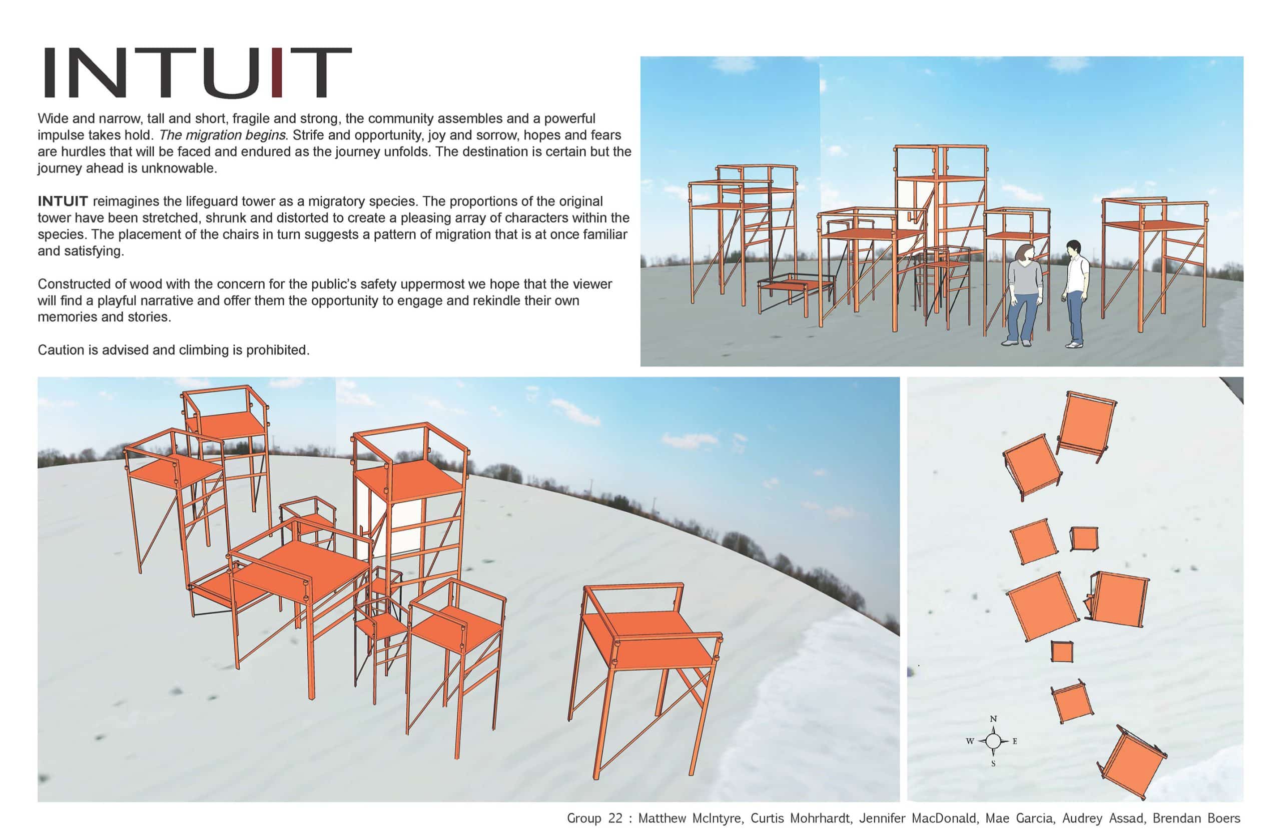 Intuit reimagines the lifeguard tower as a migratory species. The proportions of the original tower have been stretched, shrunk and distorted to create a pleasing array of characters within the species. The placement of the chairs in turn suggests a pattern of migration that is at once familiar and satisfying. Constructed of wood with the concern for the public’s safety uppermost we hope that the viewer will add a playful narrative and offer them the opportunity to engage and rekindle their own memories and stories.