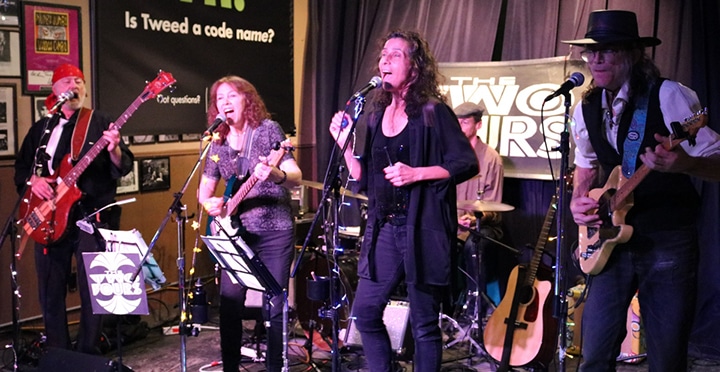 Other members of what they call “the core four” up front are Karen Gold, guitar; Susan Litchen, flute & guitar, and co-founder Corey Cousineau, on lead guitar. All the core four sing lead and harmony vocals.