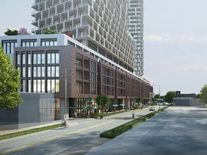 • Three residential towers standing at 49, 46 and 40 storeys, including a six-storey community centre at 6 Dawes Rd. (at the southern tip of Dawes Road just north of the Danforth GO station platform).