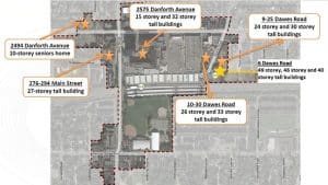 Character Area C – Bordered along Main Street to the east, Danforth Avenue to the north, Dawes Road to the west and the East Toronto Athletic Field and rail corridor to the south, the city envisions this area for slender, point-form towers. The applications for 276-294 Main St., 10-30 Dawes Rd., 9-25 Dawes Rd. and 6 Dawes Rd. fall under this area.