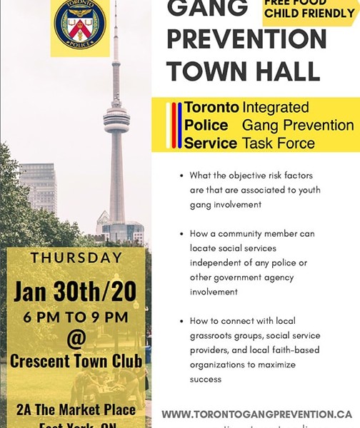 Toronto police’s Integrated Gang Prevention Task Force will hold a Town Hall meeting on Thursday, Jan. 30 at the Crescent Town Club.