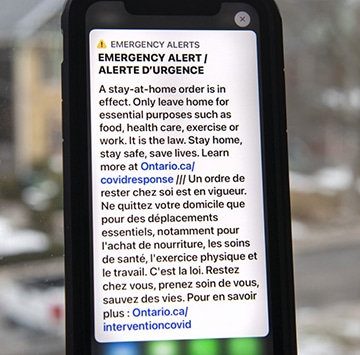 On Jan. 14, the province released information with a list of essential reasons to go out. The link to the info was sent as a blanket warning to all smartphones with a message that a stay-at-home order is in effect.