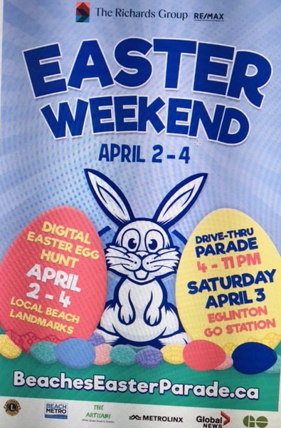 Sponsors for the Beaches Easter celebrations are The Richards Group Re/Max/Hallmark, The Artisans, Metrolinx GO, Beach Metro News, Global TV, and the Toronto Beaches Lions Club.