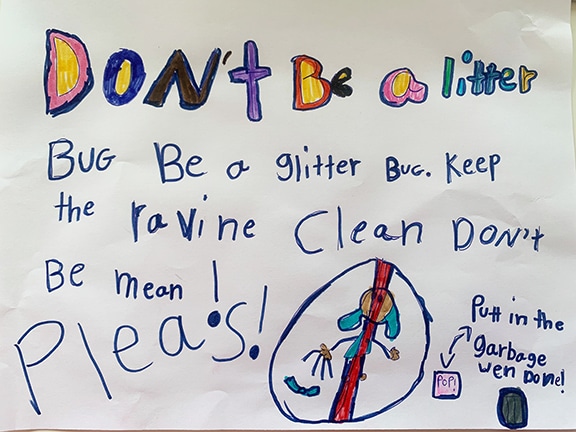 Some of the suggested messages young poster-makers could use are “Please Stay on the Trails”, “Please Keep Your Dogs Leashed”, “Litter Hurts” and “Help Save Our Ravine”.