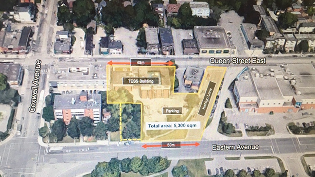 The city-owned parcel of land to be developed does not include the six-storey Toronto Community Housing (TCH) building at the northeast corner of Coxwell and Eastern or the East End Community Health Centre right on the southeast corner of Coxwell and Queen. Also, the site does not include the land where the Harvey’s restaurant is located, which gives the lot shape an indentation south of Queen. However, the development proposal does include a portion of the TCH lands at 1080 Eastern Ave.