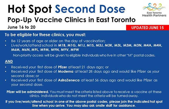 East Toronto Health Partners have adjusted the eligibility of those who can get shots at a series of “Hot Spot Second Doses” COVID-19 vaccination pop-up clinics taking place locally this week.